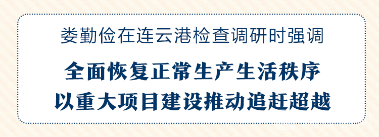 荔枝新闻讯 3月18日至19日,江苏省委书记娄勤俭在连云港检查调研。他强调,要坚持以习近平新时代中国特色社会主义思想为指导,按照中央部署要求科学统筹疫情防控和经济社会发展,全面恢复正常生产生活秩序,系统谋划推进城市发展、自贸区建设、港口提升、对外开放,以高水平重大项目建设引领发展、成就未来,在高质量发展的道路上实现追赶超越。