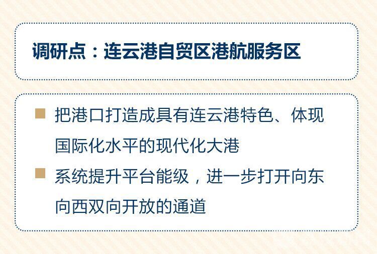 连云港自贸区港航服务区设计吞吐能力近5000万吨,去年集装箱吞吐量478万标箱。娄勤俭听取港口规划建设情况汇报,指出自贸区片区建设是国家赋予连云港的重大任务,要进一步开阔视野、创新思路、大胆改革,聚焦贸易便利化,充分发挥港口铁路联运优势,整合更多资源,提升规划建设水平,把港口打造成具有连云港特色、体现国际化水平的现代化大港。在连云港雅仕“一带一路”供应链基地项目建设现场,娄勤俭肯定了项目运作思路,希望他们立足连云港海上航线和我省腹地产业优势,在“一带一路”沿线布局物流中心、生产基地建设,积极争取进出口环节支持,系统提升平台能级,进一步打开向东向西双向开放的通道。