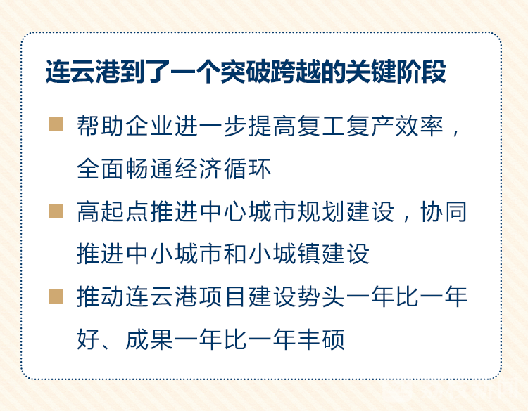 娄勤俭在调研中肯定了连云港疫情防控和复工复产取得的成绩。他强调,连云港面临“一带一路”建设、自贸试验区发展、长三角一体化发展、沿海开发等多重战略机遇,经过这几年的持续努力,已经奠定了良好基础,到了一个突破跨越的关键阶段,要切实扛起一茬人的责任,深入学习贯彻习近平新时代中国特色社会主义思想,不断以新思想解放思想、统一思想,坚定不移落实新发展理念,朝着更高的目标迈进。连云港作为全省开放布局中的重要城市,疫情防控要把防境外输入作为当前重点,加强人文关怀,做到暖心服务,确保可知可控、精准防控,在此基础上帮助企业进一步提高复工复产效率,全面畅通经济循环。要充分发挥连云港山海相连、港城相依的独特优势,高起点推进中心城市规划建设,打造现代化产业名城、旅游名城,同时按照彰显海滨特色、丰富内涵、完善功能的要求,协同推进中小城市和小城镇建设。要始终把重大项目建设作为高质量发展的重要战场,作为锻炼提升干部干事创业能力的重要阵地,作为把握机遇、用好机遇的重要检验,进一步形成抓投资、抢时效、优服务的鲜明导向,推动连云港项目建设势头一年比一年好、成果一年比一年丰硕。