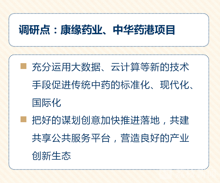 医药产业是连云港的特色产业。娄勤俭考察了康缘药业中医生产智能工厂,对企业创新中药研发和产业化的实践,以及抗击新冠肺炎疫情中作出的贡献给予高度评价。他说,中药发展正面临新的机遇,要充分运用大数据、云计算等新的技术手段促进传统中药的标准化、现代化、国际化,更好地发展壮大企业、造福人类健康。中华药港项目去年8月正式启动,一期将建设孵化器、示范工厂、安评中心等公共配套工程,娄勤俭指出,连云港的产业基础和创新优势,决定了这里有条件有希望打造具有世界知名度的医药产业高地,要把好的谋划创意加快推进落地,充分发挥龙头企业的带动作用,共建共享公共服务平台,营造良好的产业创新生态,孵化培育和引进集聚更多创新企业,把药港的蓝图尽快变成现实。