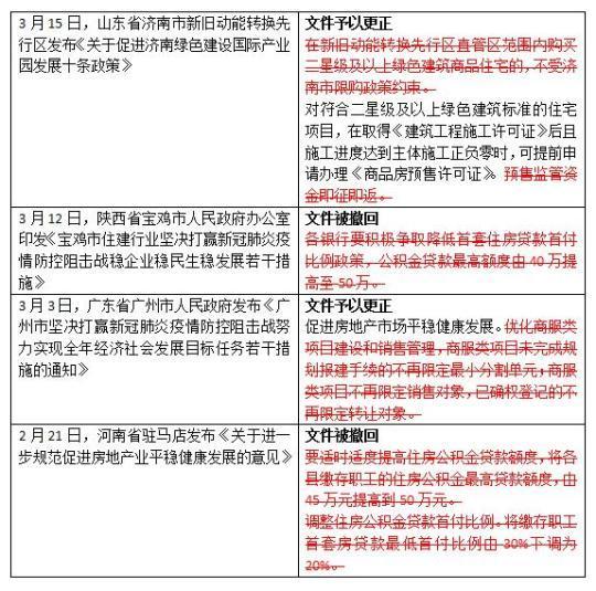 在修改删除或撤回的政策中可以看到,驻马店市和宝鸡市的政策都提及“降低首套房贷款首付比例”;济南市的政策提及“松绑限购”;广州市的政策则被认为是解禁“类住宅”。