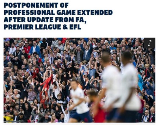 北京时间19日晚,英足总官方宣布,英超在内的英格兰所有职业比赛至少暂停至4月30日。