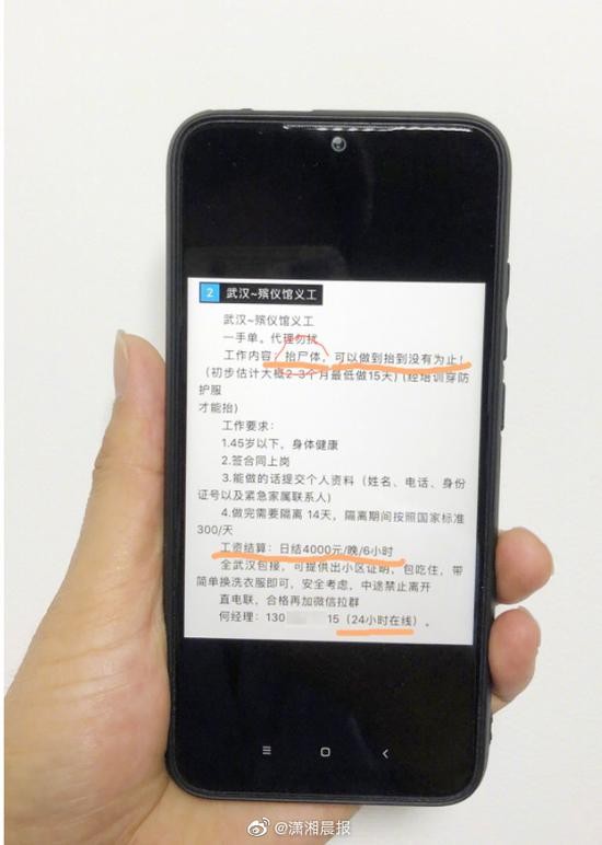 近日,网上热传一则招聘启事,称是武汉的殡仪馆招义工,工作内容就是“抬尸体”,工资日结,4000元/晚/6小时。记者采访到启事中的联系人,何先生称他并不是招聘人,自己的电话是被泄露后被人编造进去的,每天骚扰电话几乎每天不断,最多时一天200多来电。