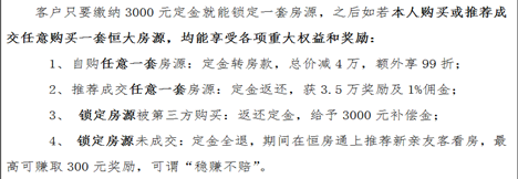 从2月13日全面启动网上卖房至今,从“5000元撬动10000元现金奖励+1个点的佣金”,到“3000元赚取35000元现金奖励+1个点的佣金”,到“只要推荐成交,就能获得35000元的现金奖励+1%的佣金”,再到今天推出的 “619个楼盘一房一价”大曝光,恒大一直不断优化相关福利措施,让利于民,还利于民。目前,恒大全国所有楼盘 78 折的特大优惠,通过恒房通平台推荐还能享受额外 97 折。此外,根据楼宇去化率、不同付款方式还能享受多重优惠,如一次性付款享受 93 折、常规按揭 95 折;单栋楼去化率达到 90%的,可再享受 94 折。不仅如此,“只要推荐成交,就能获得35000元的现金奖励+1%的佣金”,简而言之,就是参与活动后自己购买任意一套恒大的房子,可享总价减4万+额外99折的优惠;同样的,你推荐别人成交恒大的房子,均可赚35000元的现金奖励+总价1%的佣金。