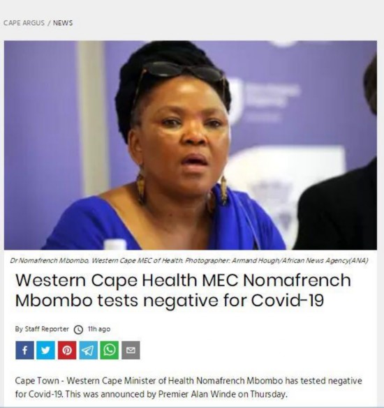 当地时间3月19日,据南非当地媒体报道,经南非西开普省省长Alan Winde证实,南非西开普省卫生部门负责人Nomafrench Mbombo新冠肺炎测试结果呈阴性。
