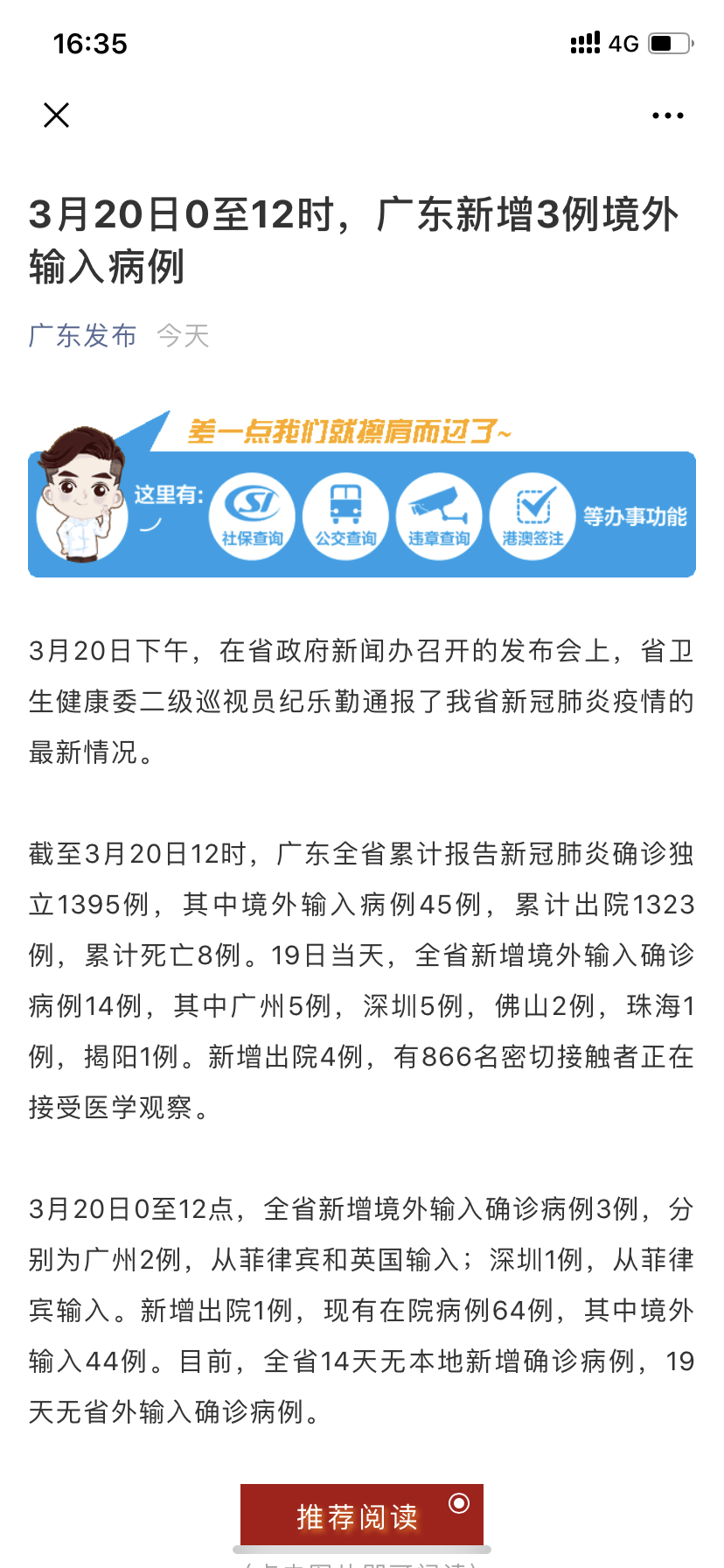 截至3月20日12时,广东全省累计报告新冠肺炎确诊独立1395例,其中境外输入病例45例,累计出院1323例,累计死亡8例。19日当天,全省新增境外输入确诊病例14例,其中广州5例,深圳5例,佛山2例,珠海1例,揭阳1例。新增出院4例,有866名密切接触者正在接受医学观察。