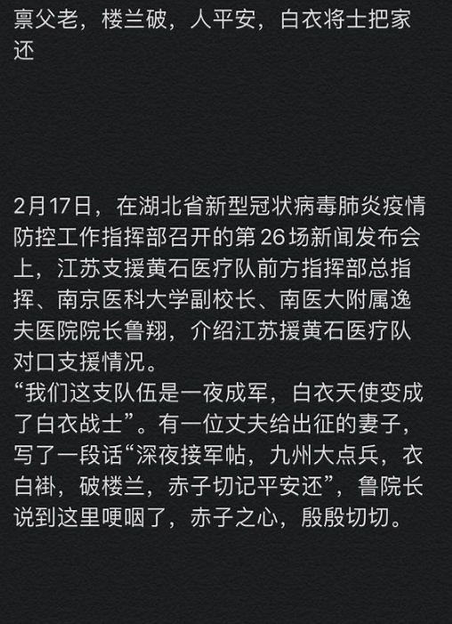 2月17日,在湖北省新型冠状病毒肺炎疫情防控工作指挥部第26场新闻发布会上,鲁翔就曾念起这首诗,一度哽咽。“深夜接军帖,九州大点兵。衣白褂,破楼兰,赤子切记平安还!”……当时,也是我出发自湖北黄石采访报道的前一天,看到视频上的鲁翔哽咽,我也非常感动。