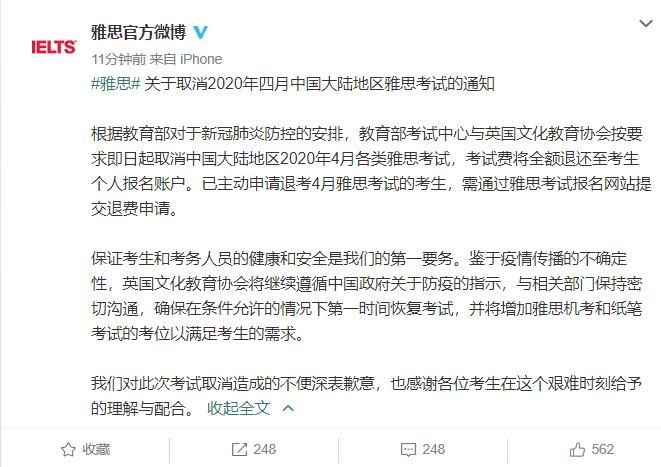 荔枝新闻讯 据“雅思官方微博”消息,他们将从即日起取消2020年四月中国大陆地区雅思考试,通报如下: