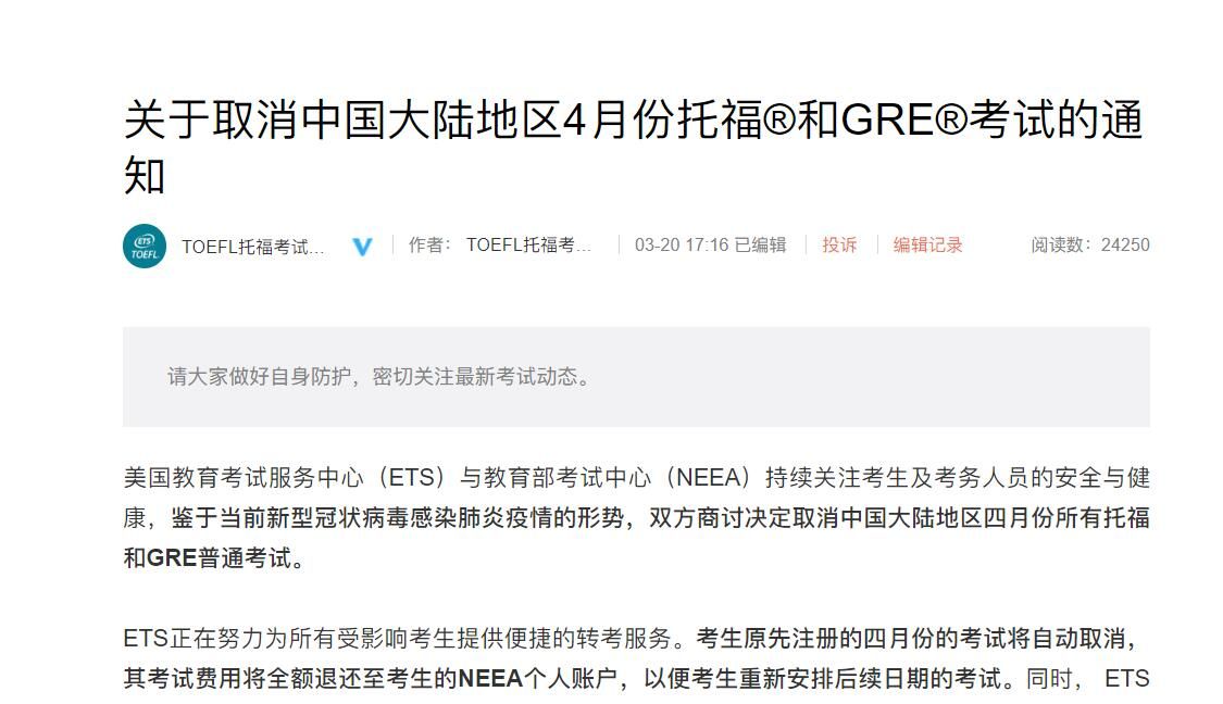 随后TOEFL托福考试官方社区也发表通知称将取消中国大陆地区四月份所有的托福和GRE普通考试,声明如下: