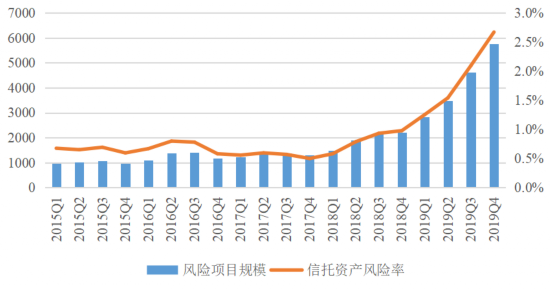 不过,信托业风险项目数量、规模以及风险资产率显著上升。2019年4季度末,信托行业风险资产规模为5770.47亿元,同比增幅159.71%;风险项目数量为1547个,较2018年末增加675个;2019年末,不良率大幅上升至2.67%。