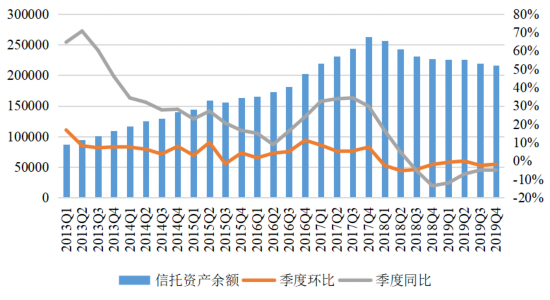 数据显示,截止2019年4季度末,全国68家信托公司受托资产规模为21.6万亿元,较2018年年末的22.7万亿同比下降4.85%,而2018年资产规模同比下降的幅度高达13.50%。从4个季度的环比变化看,去年1季度环比增速为-0.7%,2季度和3季度环比增速分别是-0.02%和-2.39%,4季度则是-1.78%。