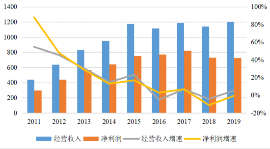 信托业协会:2011-2019年经营收入、利润总额及其同比增速