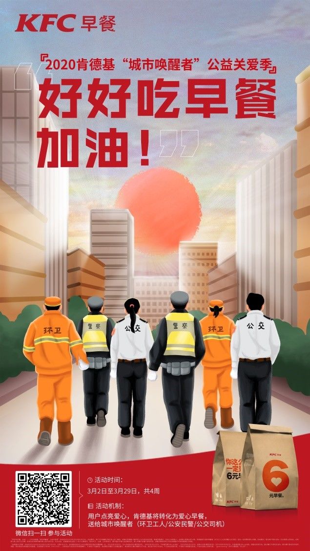 作为城市中的一员,肯德基自3月2日起,在全国范围开启“城市唤醒者”公益关爱季。活动期间,消费者可扫描肯德基餐厅易拉宝上的二维码,或通过肯德基小程序进入H5内的活动页面,仅需动动手指即可点亮爱心加入为“城市唤醒者”加油的行列。消费者每送出10个爱心,肯德基便为“城市唤醒者”送出1份早餐,用温暖的美食向他们致谢、为他们加油。