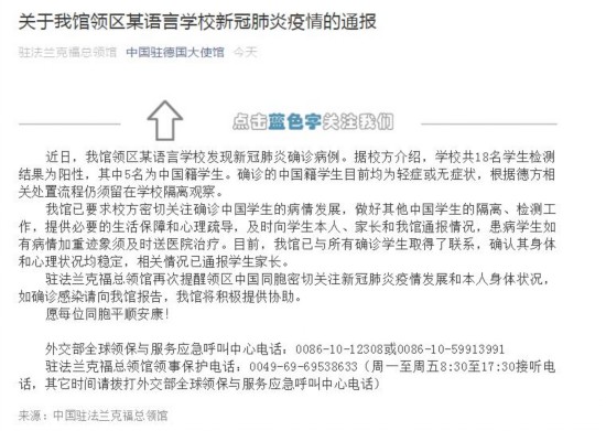 荔枝新闻讯 据中国驻德国法兰克福总领馆消息,近日,我馆领区某语言学校发现新冠肺炎确诊病例。据校方介绍,学校共18名学生检测结果为阳性,其中5名为中国籍学生。确诊的中国籍学生目前均为轻症或无症状,根据德方相关处置流程仍须留在学校隔离观察。