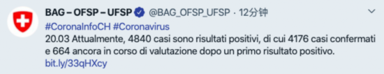据瑞士联邦公共卫生局消息,瑞士的新冠肺炎检测结果为阳性病例达4840例(累计确诊4176例),累计死亡病例43例。