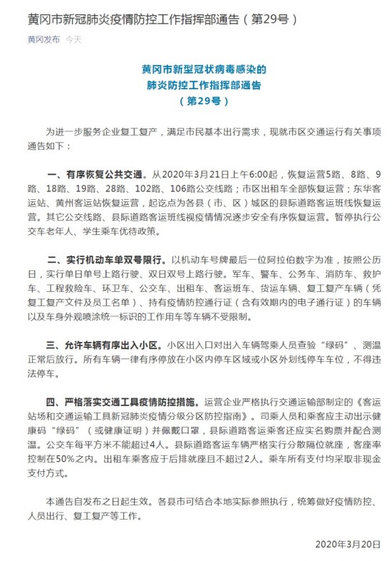 一、有序恢复公共交通。从2020年3月21日上午6:00起,恢复运营5路、8路、9路、18路、19路、28路、102路、106路公交线路;市区出租车全部恢复运营;东华客运站、黄州客运站恢复运营,起讫点为各县(市、区)城区的县际道路客运班线恢复运营。其它公交线路、县际道路客运班线视疫情情况逐步安全有序恢复运营。暂停执行公交车老年人、学生乘车优待政策。