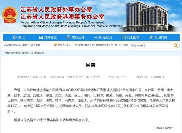 为进一步防控境外疫情输入风险,江苏省自3月20日零时起调整江苏涉外疫情防控重点国家名录,在韩国、伊朗、意大利、日本、法国、西班牙、德国、美国、英国、瑞士、瑞典、比利时、挪威、荷兰、丹麦、奥地利16国基础上,新增澳大利亚、马来西亚、希腊、捷克、芬兰、卡塔尔、加拿大、沙特阿拉伯等8国作为疫情防控重点国家。凡在进入江苏之日前14天内,有上述24国旅行或居住史的所有中外人员,要实施集中医学观察14天(条件不允许的可实施居家医学观察)。
