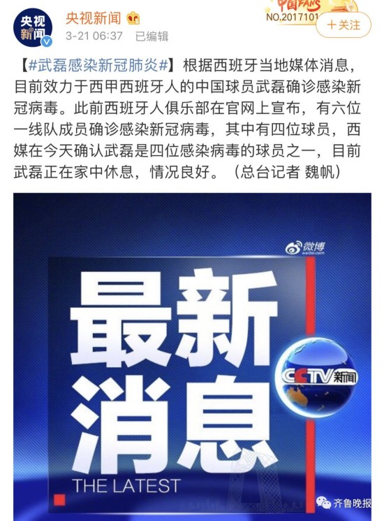 同一天,武磊经纪人也向中国球迷报了平安:“西班牙人正在分批次检测,武磊正在家里隔离,还不清楚6位确诊者的名字。”