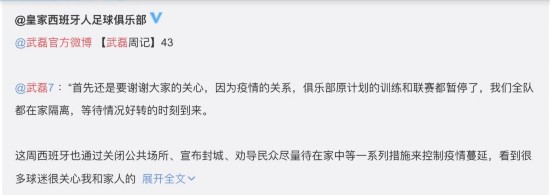 值得一提的是,18日21时,武磊在自己的社交媒体上更新了“武磊周记”,表示自己正在家隔离,等待情况好转的时刻到来。但并没有透露自己是否进行了检测和检测结果如何。