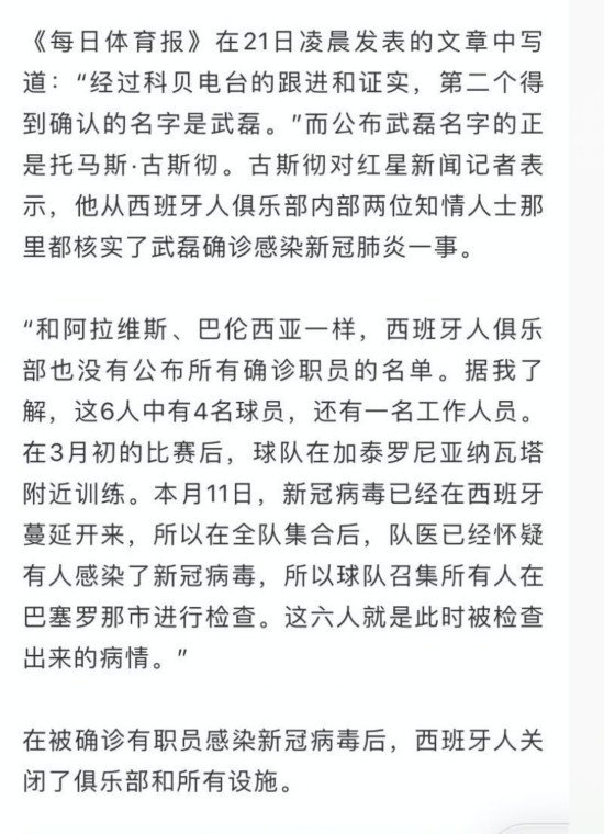 21日,西班牙《每日体育报》发文表示,科贝电台记者已确认武磊是西班牙人确诊新冠病毒的球员之一!