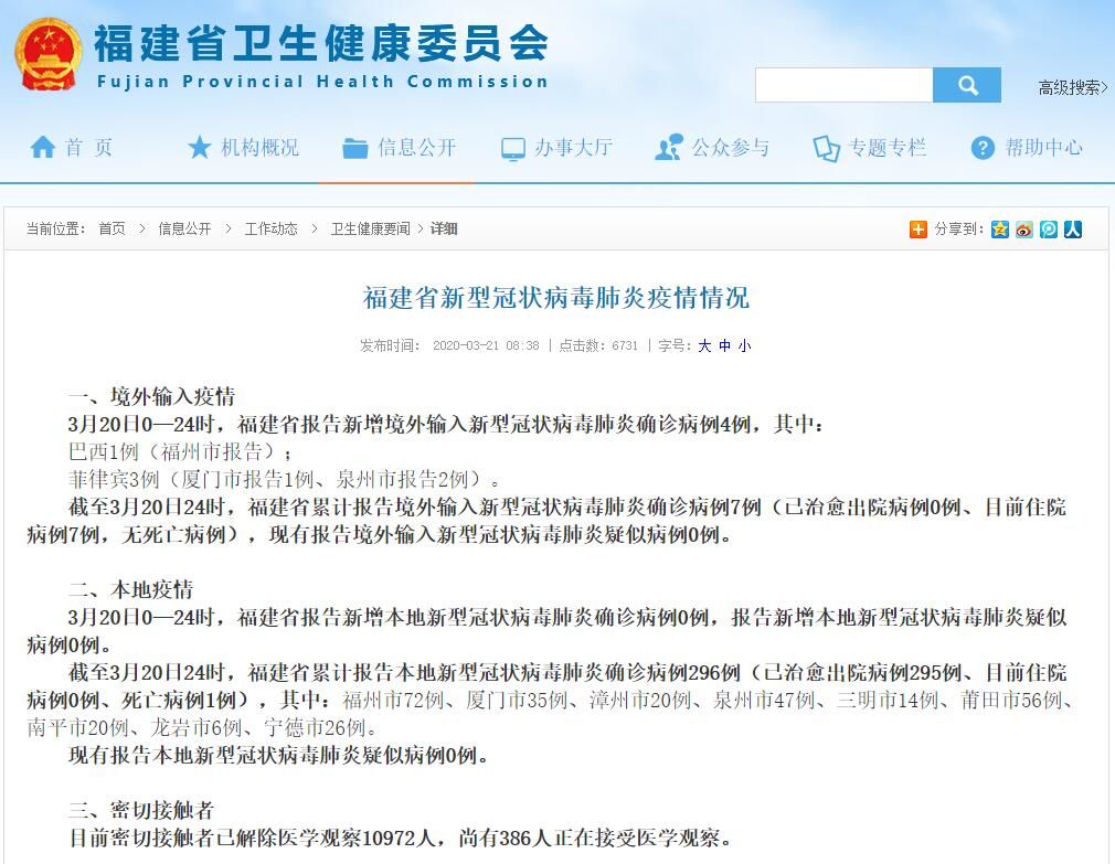3月20日0—24时,福建省报告新增境外输入新型冠状病毒肺炎确诊病例4例,其中: