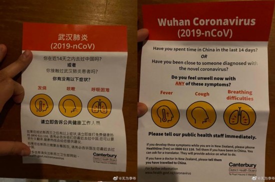 坎特伯雷地区卫生局21日告诉环球时报-环球网记者,这份传单自1月27日新冠肺炎疫情暴发初期开始,被分发给从中国大陆飞抵坎特伯雷首府基督城的旅客,“当时该病毒通常被称为‘武汉冠状病毒’”。一位新西兰华人21日向环球时报-环球网记者透露,标有“武汉肺炎”的传单引发了大量投诉和社交媒体上的广泛批评。