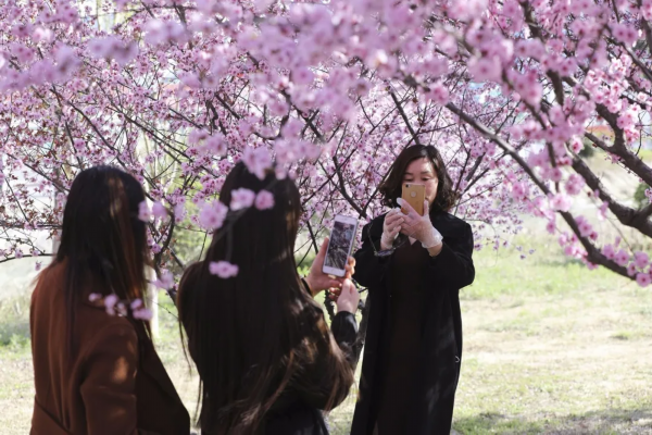 游客们纷纷在花间驻足,或静静赏花,或拍照留念,尽情享受春天的气息。