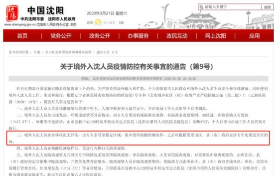 3月17日,沈阳市新冠肺炎疫情防控指挥部发布通告,自3月19日零时起,境外入沈人员如身体状况无异常,由各区、县(市)安排专车免费接到指定地点,集中组织核酸检测取样。检测期间,境外入沈人员应在原地等候检测结果。等候检测结果期间如产生食宿费用,由各区、县(市)政府承担。
