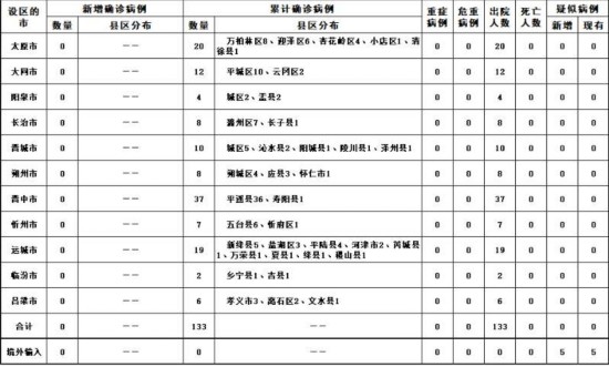 荔枝新闻讯 2020年3月21日0时至24时,山西省本地无新增新型冠状病毒肺炎确诊病例,累计报告确诊病例133例,治愈出院133例。无新增疑似病例,现有疑似病例0例。