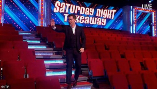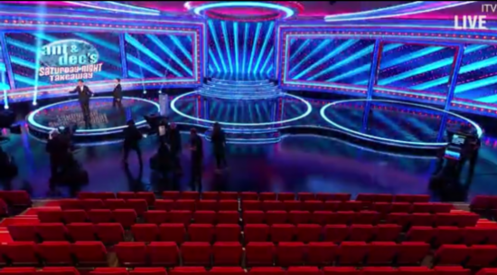 据英国《每日邮报》报道,《周六晚间外卖》(Saturday Night Takeaway)是英国一档知名综艺节目,最新一期节目受疫情影响,采取无观众的方式播出。21日的直播间里,主持人安东尼 麦帕特林(Anthony McPartlin)和德科兰 当纳利(Declan Donnelly)站在台上,观众席上空无一人。