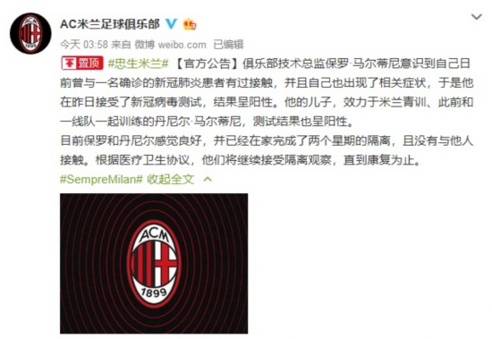 俱乐部技术总监保罗·马尔蒂尼日前与一名新冠患者接触,并开始出现了相关症状。他于昨日接受了测试,结果呈阳性。他的儿子,效力于米兰青训、此前和一线队一起训练过的的丹尼尔,检查结果也呈阳性。