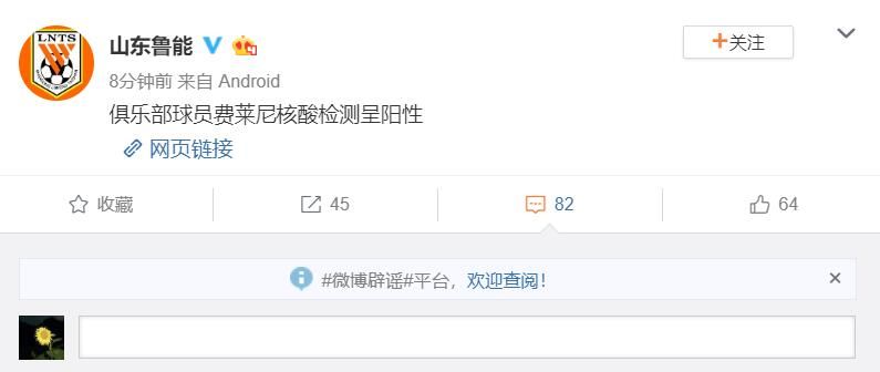 荔枝新闻讯 3月22日下午,中超山东鲁能俱乐部官方证实,经官方检测确认,俱乐部球员费莱尼在隔离观察期间新冠病毒检测呈阳性,球员在此期间体温一直正常,且无其他不适,目前已在指定医疗机构接受进一步观察治疗。