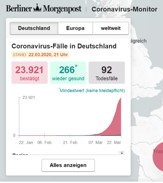 【环球网快讯】根据《柏林晨报》实时数据,截至北京时间22日21时,德国新冠肺炎累计确诊病例23921例,累计死亡病例92例;而昨天同一时刻,即截至北京时间21日21时,德国新冠肺炎累计确诊病例21483例,累计死亡病例73例。