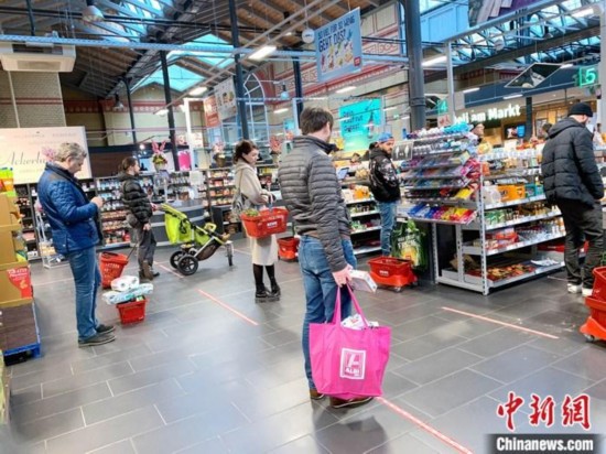 20日当天,柏林一家超市等待付款的人们相互隔开了1.5米的距离。中新社记者 彭大伟 摄