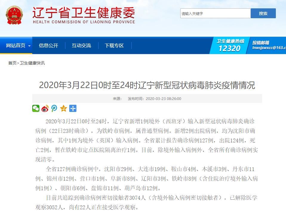 荔枝新闻讯 据辽宁省卫健委官网消息,2020年3月22日0时至24时,辽宁省新增1例境外(西班牙)输入新型冠状病毒肺炎确诊病例(22日23时确诊),为铁岭市病例,属普通型病例。新增2例出院病例,均为沈阳市确诊病例,其中1例为境外(英国)输入病例。全省累计报告确诊病例127例,出院124例,死亡2例,暂在铁岭市定点医院隔离治疗1例。目前,除境外输入病例外,全省所有确诊病例实现清零。