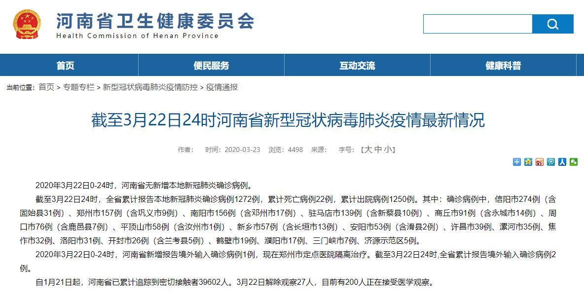 自1月21日起,河南省已累计追踪到密切接触者39602人。3月22日解除观察27人,目前有200人正在接受医学观察。