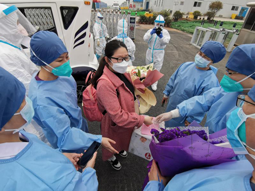 出院前在病房里,医护人员为她穿上新衣服,病区主任曲东霞及护士长勾玉莉贴心地为她准备了鲜花、点心、巧克力、奶粉、奶瓶、尿不湿、背包、宝宝穿的小衣服等。大连医科大学附属第二医院地负责人与医护人员听说小胡要出院了,纷纷等候在雷神山医院门口来送她出院。雷神山医院袁玉峰院长还为孕妇发了出院证明卡。这是雷神山医院唯一一名孕妇新冠患者。孕妇小胡表示,她非常感谢医护人员对她的治疗和关心,不仅治疗了她的疾病,而且给予了她心理上的疏导和爱护,她非常舍不得离开这些可爱的医护人员。她说,等宝宝出生后,一定要带宝宝去辽宁大连看望这些叔叔阿姨们,去看看那里的大海!另外,她还想请医护们帮忙征集宝宝的名字,希望用宝宝的名字记录下湖北武汉和辽宁大连的深深情谊。