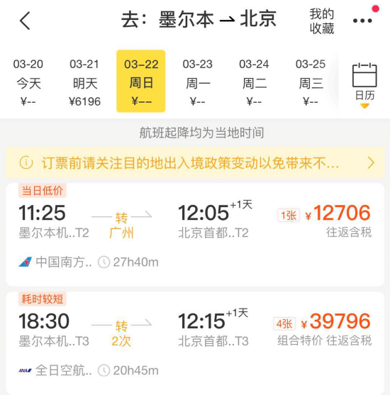 王凡凡搜到的近期从墨尔本回国的机票价格。受访者供图