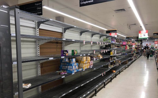 “封国”第一天,墨尔本一家超市,饼干、纸巾、罐头、意大利面的货架已经空了。受访者供图