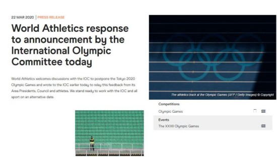 国际田联在发布的公告中写道:国际田联愿与国际奥委会就推迟2020年东京奥运会展开讨论,并已于早些时候致函国际奥委会,将来自各区域协会以及运动员的反馈传达至国际奥委会。我们随时准备在另一个日期与国际奥委会和整个体育界展开合作。