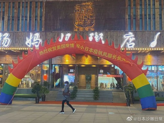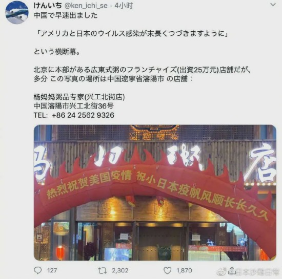 【撰文/赵三军 统筹/刘姝蓉】今天上午,一家粥店架设拱门、张挂横幅诅咒疫情中的外国人的图片在网络疯传,横幅上写着“热烈祝贺美国疫情 祝小日本疫帆风顺长长久久”,大白新闻了解到,这家粥店为“杨妈妈粥店”沈阳太原街旗舰店,该图片在日本社交媒体上也被大量转发评论。3月23日下午,沈阳市和平区城管局工作人员告诉大白新闻,22日晚上,该店已将横幅自行撤下,23日上午,执法人员已将悬挂横幅的拱门拆除,目前警方已对此事介入调查。大白新闻梳理发现,“杨妈妈粥店”号称“中国粥文化品牌引领者”,但当地媒体分别在2014年、2019年曝光过“杨妈妈粥店”其他两家连锁店的卫生问题。