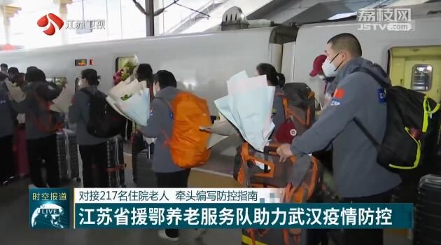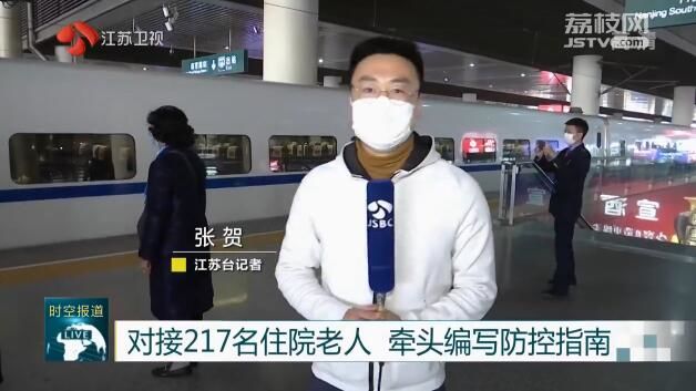 江苏台记者张贺说:“这里是高铁南京南站,现在是下午4点12分,随着高铁进站, 江苏援鄂养老服务队的56名队员正在陆续下车,至此,他们也圆满顺利的结束了长达33天的武汉抗疫一线工作。”