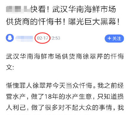2020年2月,一篇题为《华南海鲜市场供货商的忏悔书!曝光巨大黑幕!》的涉疫情文章突然爆红网络。