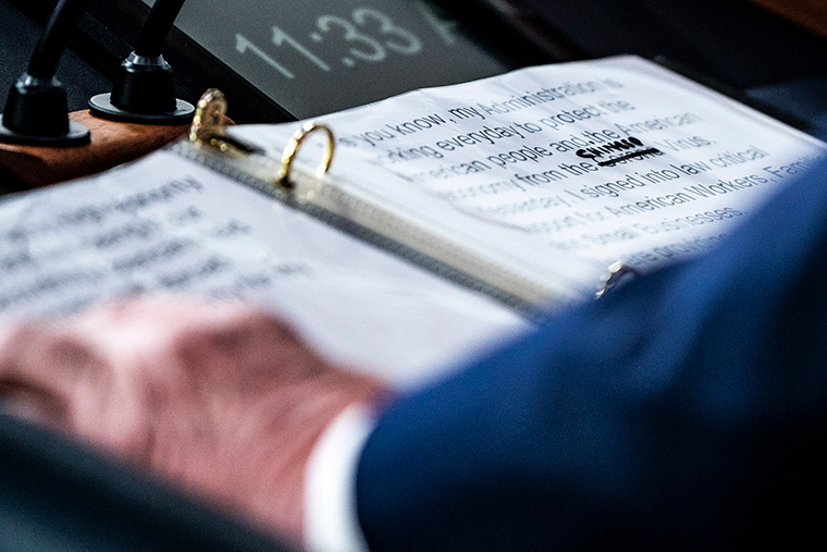 美国总统特朗普的演讲稿将“新冠病毒”涂改为“中国病毒”(资料照片)