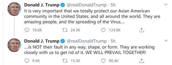 在多次将新冠病毒称为“中国病毒”,影响波及亚裔群体后,美国总统特朗普当地时间23日发推,提及亚裔。他在推文中称“保护亚裔美国人群体很重要”,他还形容亚裔群体是“很棒的人”,并说“新冠病毒传播不是他们的错”。