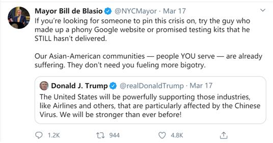 纽约市长比尔 德布拉西奥17日在推特上说:“我们的亚裔美国人群体——即你所服务的人们——已经在遭受苦难。他们不需要你助长更多的偏执。”纽约州是美国受病毒影响最严重的地区之一。