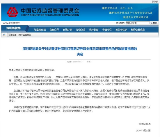 近日,中国证监会深圳证监局公布了一条行政监管措施决定书,为华泰证券受罚纪录再次多添一笔。