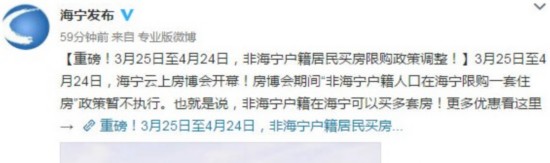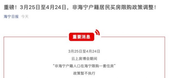 浙江海宁即将启动“云上房博会”,但今天传来一条重磅消息:3月25日至4月24日,海宁云上房博会期间“非海宁户籍人口在海宁限购一套住房”政策暂不执行。倘若成真,非海宁户籍在海宁可以买多套房。