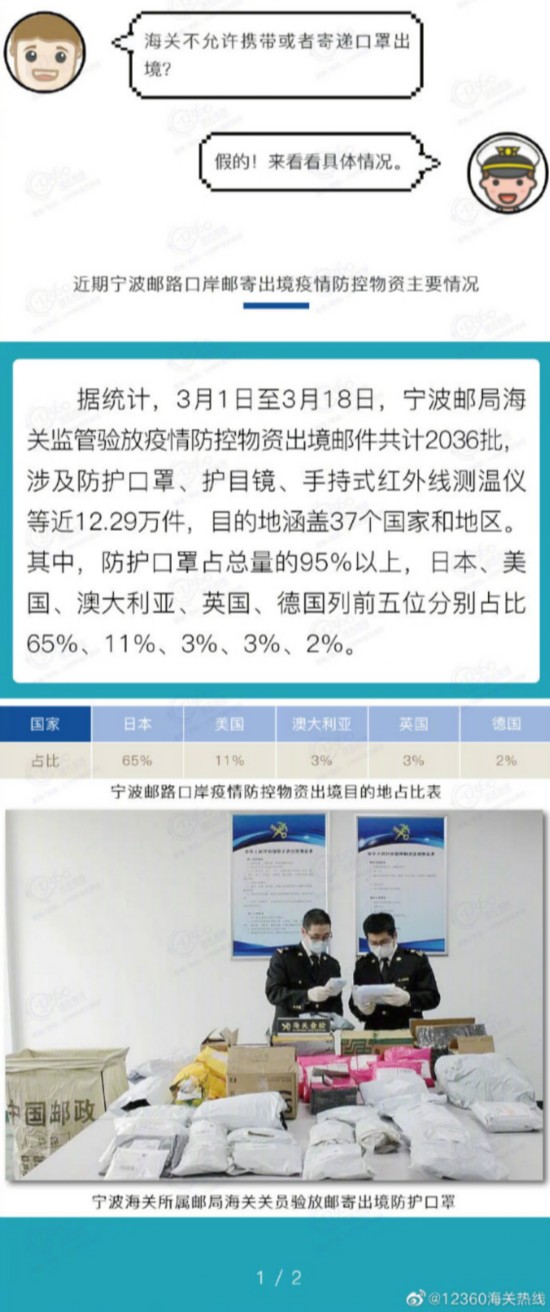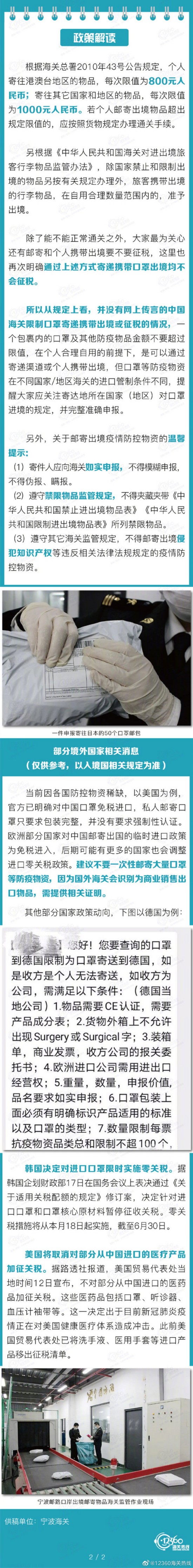 近期,全球许多国家地区新冠肺炎疫情呈现不断蔓延暴发态势,国内很多朋友关心海外华人华侨安危,纷纷询问目前中国海关对于口罩等防疫物资通过寄递渠道或个人携带出境的规定,网上也出现了不少针对中国海关会查扣出境口罩包裹的谣言。详见长图: