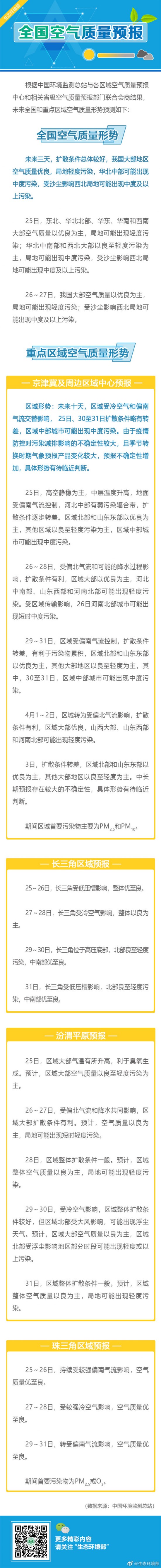 中新网3月24日电 据生态环境部官方微博消息,生态环境部24日发布全国空气质量预报:未来三天(3月25-27日),扩散条件总体较好,我国大部地区空气质量优良,局地轻度污染,华北中部可能出现中度污染,受沙尘影响西北局地可能出现中度及以上污染。